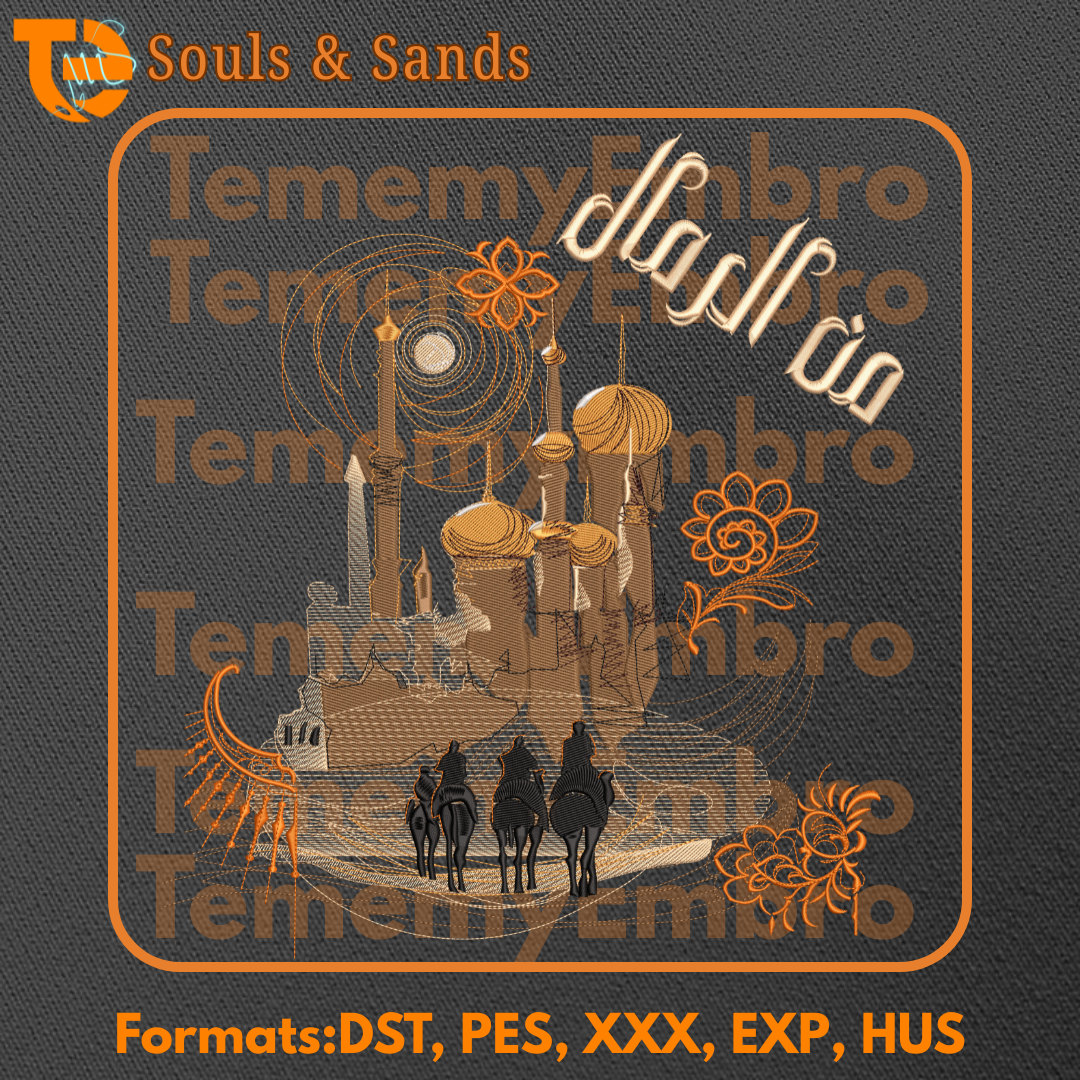 “Embark on a journey to the golden dunes with this ‘Souls & Sands’ embroidery masterpiece. Featuring a majestic oriental city with towering minarets and soft desert hills, this high-detail design is a tribute to Middle Eastern architecture and landscape.”